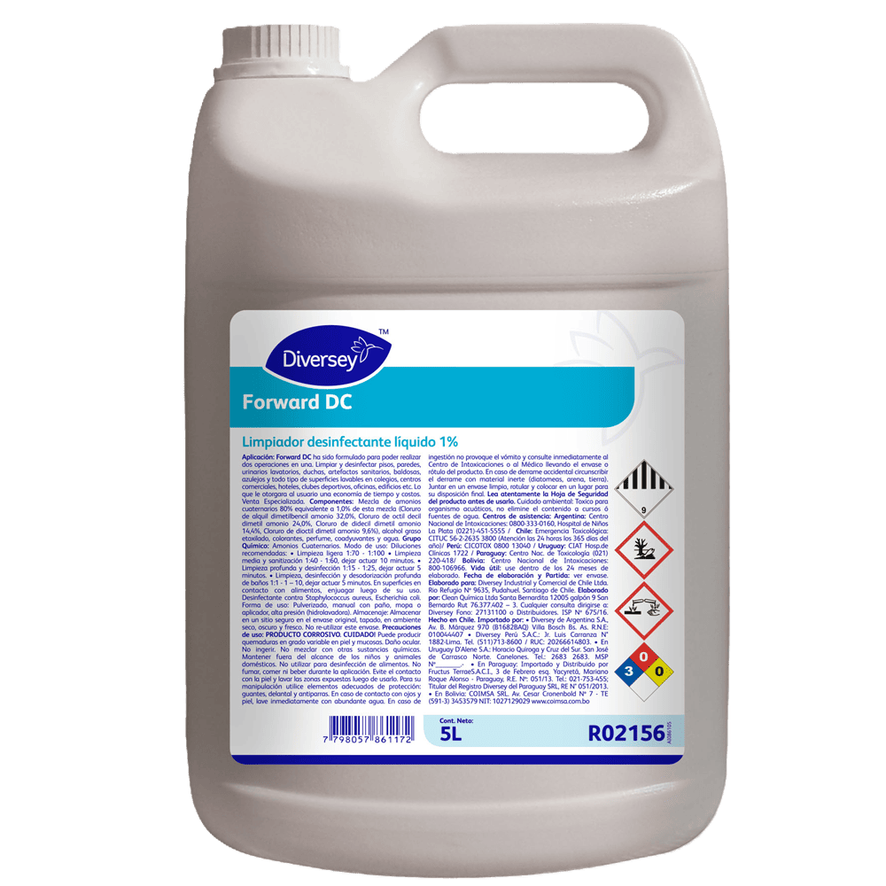 Detergente desinfectante líquido concentrado a base de activos Amonio Cuaternario 5° generación, surfactantes, agentes alcalinos y ablandadores de agua, para ser aplicado sobre pisos, paredes, etc.